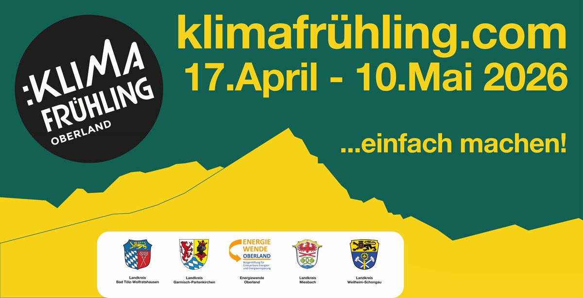 Mit dem Klimafrühling Oberland 2026 zeigt sich einmal mehr das große Engagement vieler ehrenamtlicher Bürgerinnen und Bürger, Initiativen und Vereine und auch Unternehmern: Sie setzen sich mit Herzblut für nachhaltige Energienutzung, Ressourcenschutz, klimafreundliche Mobilität und Klimaschutz vor Ort ein. Die Organisatoren freuen sich auf die aktive Beteiligung der Menschen im Oberland. Tragen Sie sich die Termine für Ihre Veranstaltungen im Kalender ein!